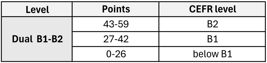 The test modules "Listening comprehension", "Reading comprehension" and "Elements of language" consist, for the B1-B2 dual level, of 59 questions. The student gets one point for each correct answer, so can score a maximum of 59 points.