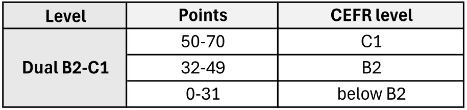 The test modules "Listening comprehension", "Reading comprehension" and "Elements of language" consist, for the B2-C1 dual level, of 70 questions. The test-taker gets one point for each correct answer, so can score a maximum of 70 points.