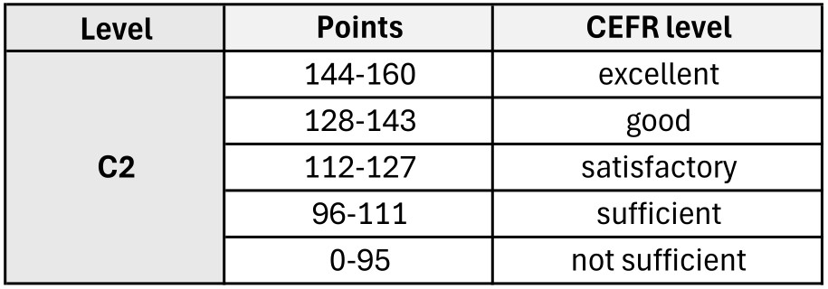 The test modules "Listening comprehension", "Reading comprehension" and "Elements of language" for level C2 allow a maximum of 160 points. The candidate gets one point for each correct answer. The candidate must obtain at least 60 per cent of the marks in the written and oral parts of the examination.