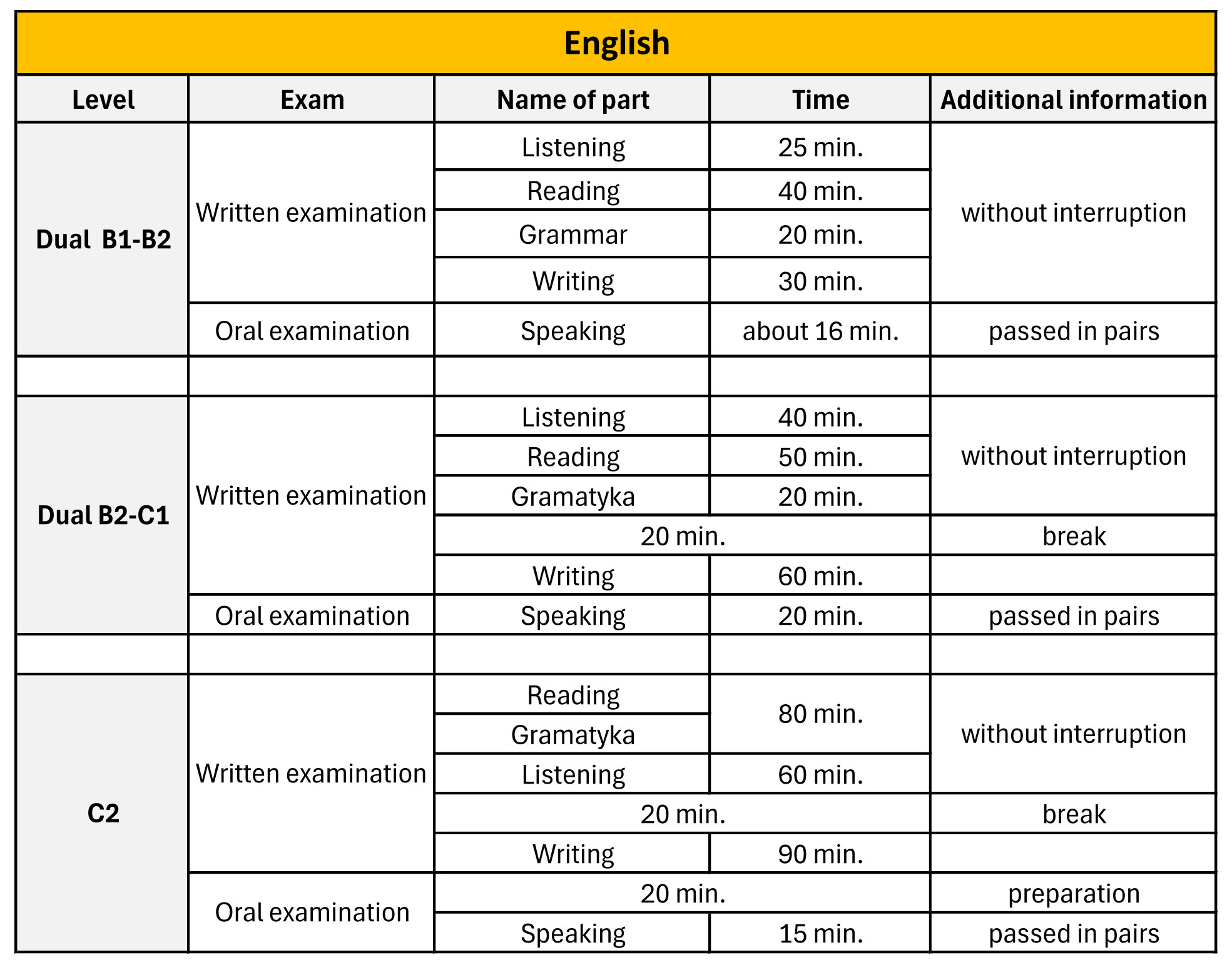 - the telc exam consists of two parts: a written part (lasting, depending on the level chosen, a total of 115 to 230 minutes) and an oral part, which usually takes place in pairs (two examinees), lasting up to 20 minutes (+20 minutes for preparation).